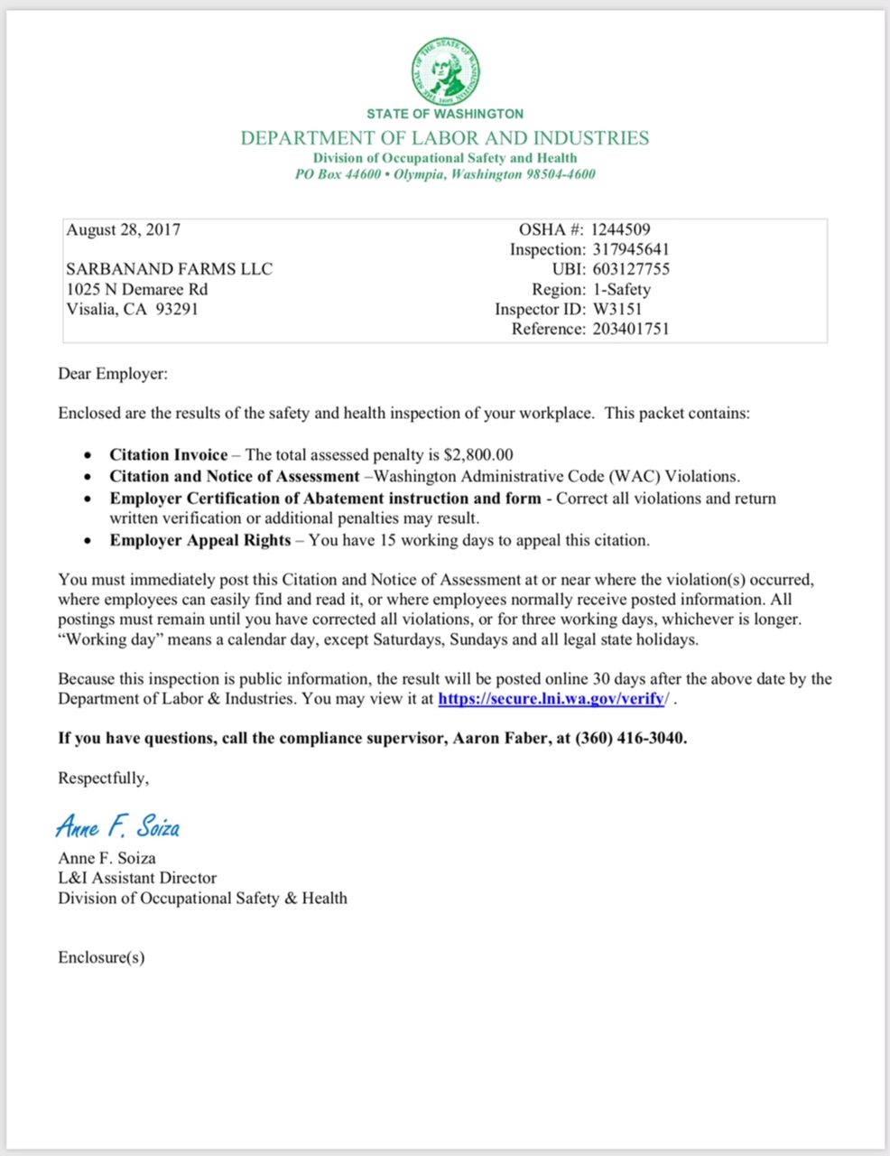 Along with answering the email questions I posed to him, Tim Church sent me a copy of a Citation and Notice of Assessment issued by L&I on August 28, 2017, to Sarbanand Farms. In looking at the citation, it appears to list 2 violations, one of which has 3 listed associated items.