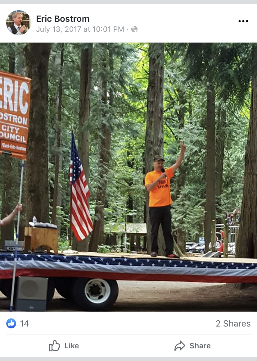 A July 13, 2017, post displayed on Eric Bostrom’s Facebook page showed that he not only attended the Whatcom Republicans’ annual picnic held that same day (July 13th) at Berthusen Park in Lynden, Washington, but that he also stood on the stage, speaking then as a candidate for Bellingham City Council, to the picnic attendees.