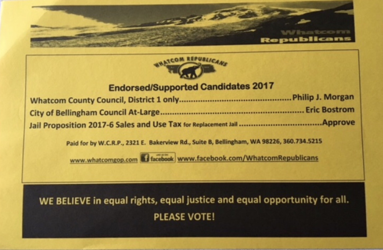 Despite Trump’s exhibited bigotry, hatred, racism, and misogyny, Whatcom Republicans continues to support and promote him and his agenda. Their organization supports President Donald Trump, and supported him in his 2016 presidential campaign. In 2016, the Whatcom Republicans officially recommended Republican candidates Donald Trump/Mike Pence for President/Vice President, listing their names on the slate card that their organization mailed out to some local voters for the election that year.