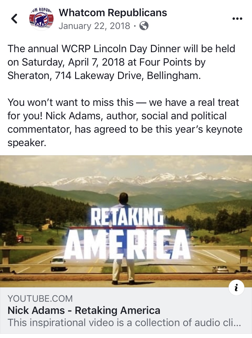 Adding to that record, was the Whatcom Republicans’ selection of Nick Adams, who has exhibited bigoted, racist, and sexist messaging, to be the keynote speaker for their annual Lincoln Day Dinner fundraiser event last year.