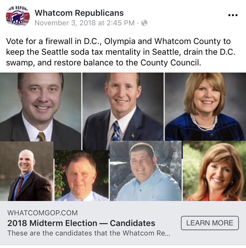 The Whatcom Republicans endorsed/supported Senator Ericksen’s 2018 and 2014 campaigns for 42nd LD senate. Ericksen’s name was listed on the slate card of recommended candidates that the Whatcom Republicans mailed out to some local voters for the 2018 general election. A November 3, 2018 post displayed on Whatcom Republicans’ Facebook page shows that Senator Ericksen was one of the candidates pictured as having been endorsed/supported by the Whatcom Republicans.