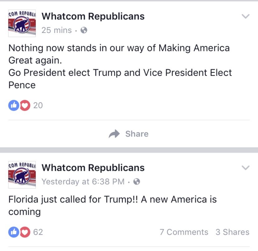 On Election Day, November 8, 2016, the Whatcom Republicans posted on its Facebook page: “Florida just called for Trump. A new America is coming.”