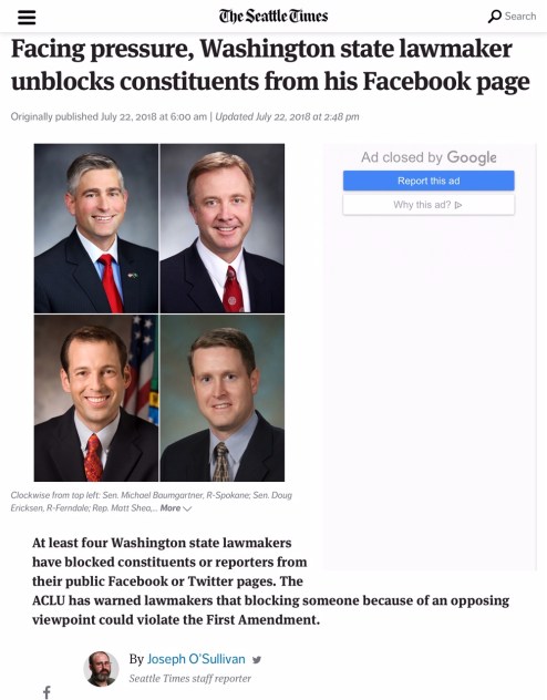 The July 22, 2018 Seattle Times article also reported that at least two Washington state lawmakers had blocked reporters from following their Twitter accounts. One of those was Rep. Matt Shea.
