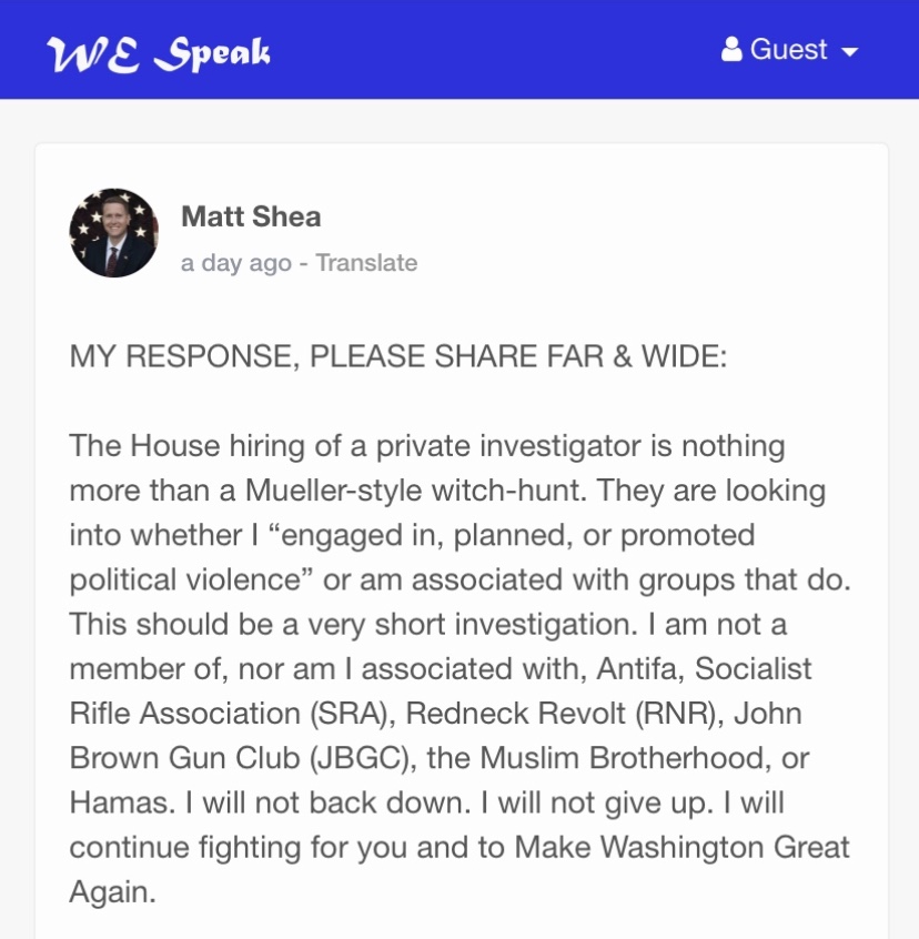 The new social media platform, We Speak, on which Rep. Shea had posted his July 30th post responding to the news he was being investigated, was created for Christian conservatives and founded by Ray Gilbride, a resident of Bellingham, Washington.