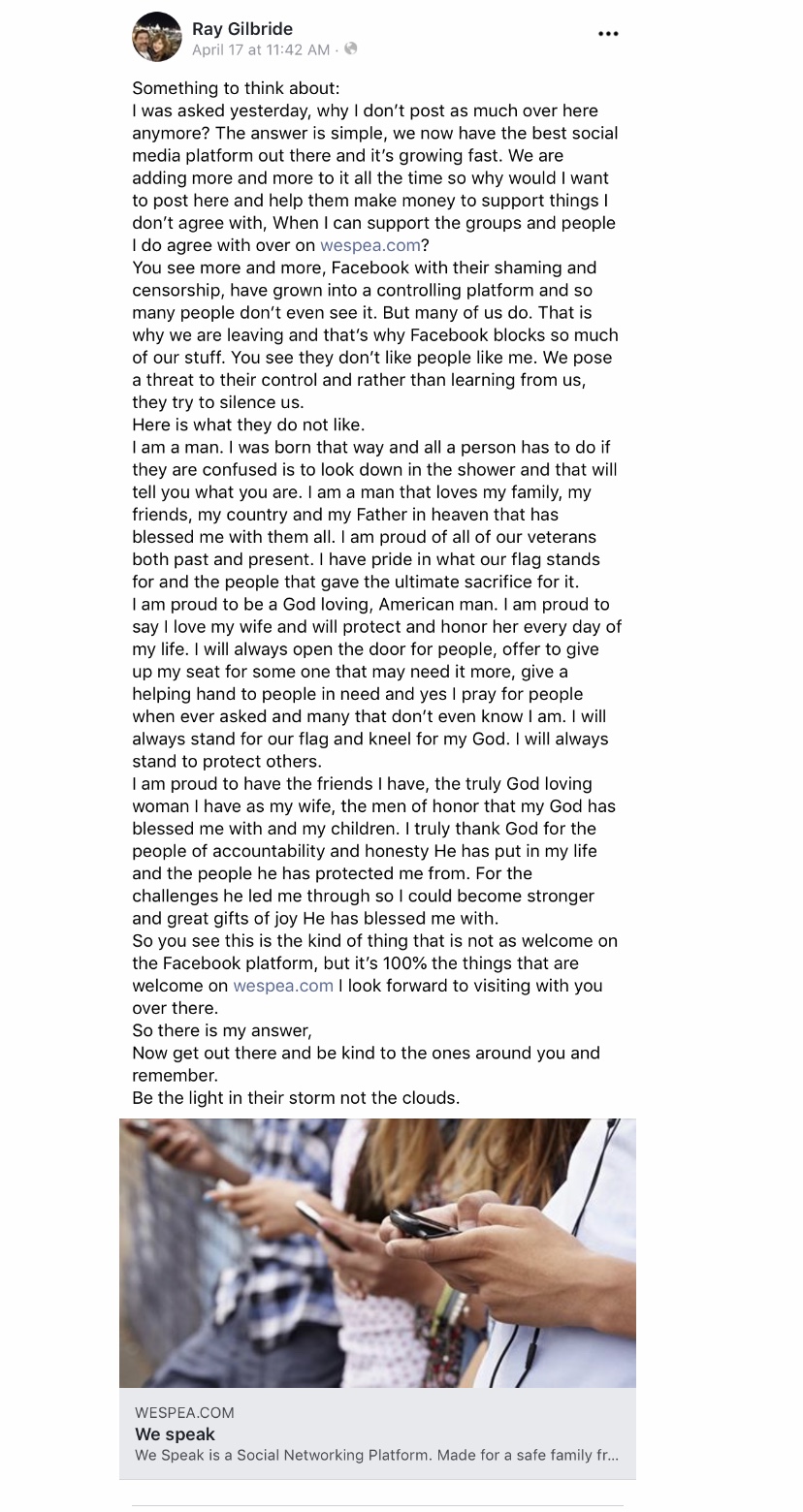 A February 25, 2019 post made by Gilbride on his Facebook page described the We Speak platform as, “a true Christian conservative family frendly [sic] alternative to this left contoled [sic] platform.”