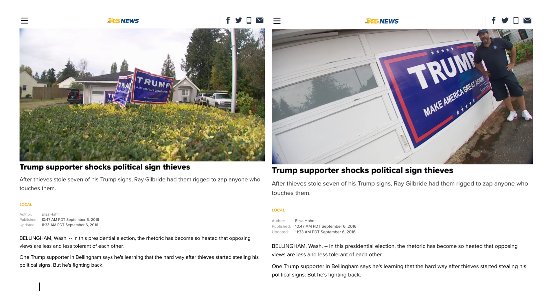 Gilbride told news media he had taken that extreme measure as a means to stop individuals from continuing to steal his pro-Trump signs after that had occurred several times.