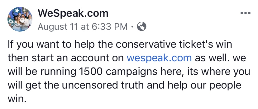 “If you want to help the conservative ticket’s [sic] win then start an account on wespeak.com as well. we will be running 1500 campaigns here, its [sic] where you will get the uncensored truth and help our people win.”