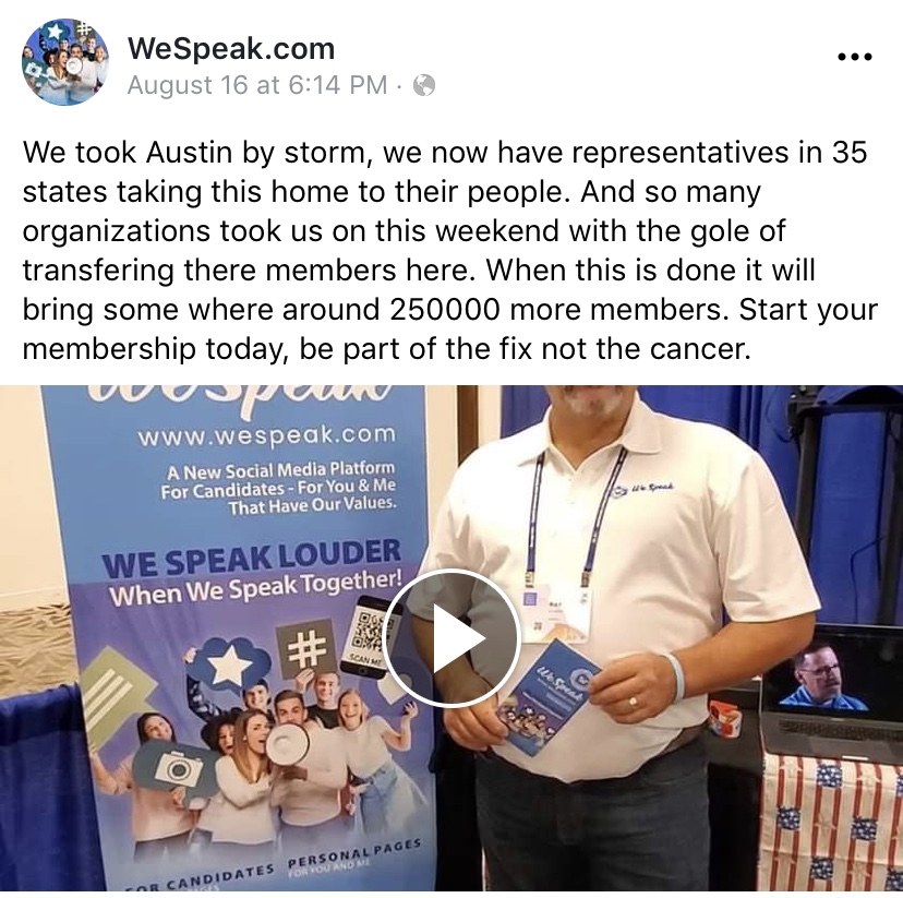 According to an August 16, 2019 post displayed on the WeSpeak.com Facebook page about the new platform’s rollout during the ALEC conference, We Speak now has, “representatives in 35 states taking this home to their people. And so many organizations took us on this weekend with the gole [sic] of transfering [sic] there [sic] members here.”