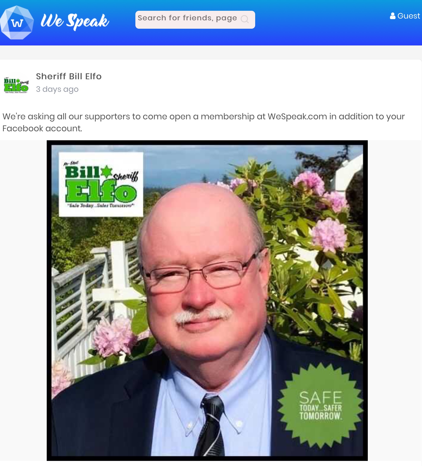 [Editor’s note: This story has been updated on September 23, 2019 to reflect the fact that sometime today (September 23, 2019) the “Sheriff Bill Elfo” profile appears to have been removed from the We Speak social media platform. Now, when searching on We Speak by entering the former profile name, “Sheriff Bill Elfo,” that particular profile no longer produces any search results. In addition to this new development, it appears that the Re-elect Sheriff Bill Elfo Facebook page has removed the post declaring that “We Speak is running most of Re-elect Sheriff Bill Elfo’s campaign,” which had been posted on that Facebook page on Thursday, September 19, 2019, and which is referenced in this article with an accompanying screenshot photo.]