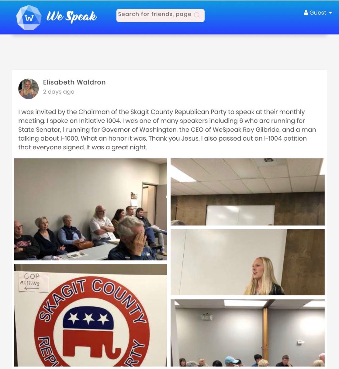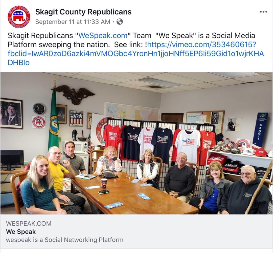 “Skagit Republicans ‘WeSpeak.com’ Team. ‘We Speak’ is a Social Media Platform sweeping the nation. Included in the post is a link to a 2-minute promotional video about We Speak that was produced by American Zealot Productions. The post indicates there may be a “We Speak.com Team” within the Skagit County Republicans’ organization that has a particular focus on We Speak.