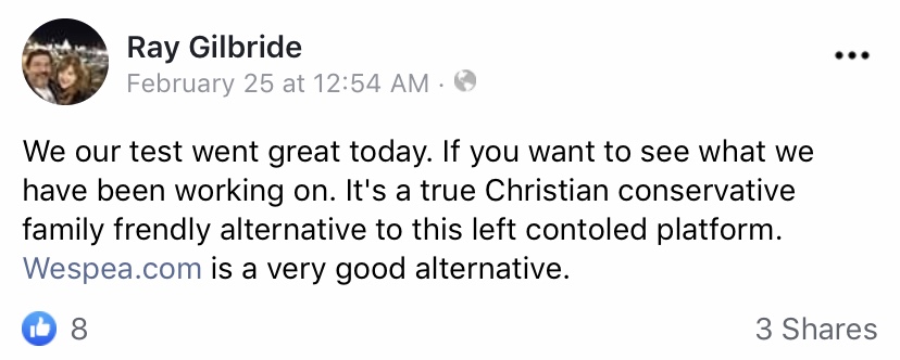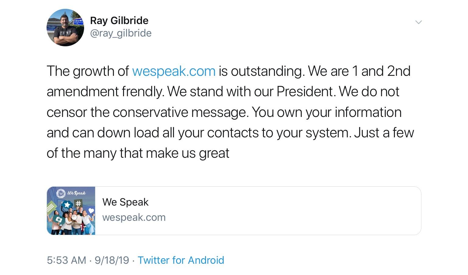 “The growth of wespeak.com is outstanding. We are 1 and 2nd amendment frendly [sic]. We stand with our President. We do not censor the conservative message. You own your information and can down load [sic] all your contacts to your system. Just a few of the many that make us great.”