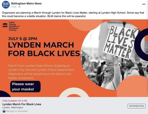 Two days later, a Facebook page created that day, on June 29, “Young Activists of Whatcom County,” posted a June 29 Facebook post that featured a graphic, announcing a July 5 event, the “Lynden March For Black Lives.” The group has since changed its name to Young Advocates of Whatcom County. YAWC also posted a Facebook event announcing the July 5 march.